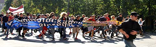 die ganze Wegstrecke über zu hören. Über den Hackeschen Markt ging es die Rosenthaler Straße entlang bis zur Torstraße, weiter über die Mollstraße, Otto-Braun-Straße, Grunerstraße und wieder auf die Spandauer und zurück zum Roten Rathaus. Unterwegs wurde auf jeder Kreuzung und zwischendurch immer mal wieder ein Stopp eingelegt und wieder waren recht gute und informative Redebeiträge dabei! Kritisiert wurden vor allem Lehrermangel, Unterrichtsausfall sowie die hohen Kosten für Schulbücher und Studiengebühren.Thematisch wurden Zusammenhänge zwischen Bildungspolitik, Privatisierungen und Neoliberalismus aufgezeigt und immer wieder darauf verwiesen, dass es sich lohnt aufzustehen und was zu tun!!! Nach etwa 2/3 der Strecke wurde bekannt, dass es eine Festnahme zu beklagen gab. Es wurden wohl Wahlplakate beschädigt. Schon einige Zeit vorher begann die Polizei damit im Spalier zu laufen, was teilweise mit Sprechchören "Haut ab! Haut ab!" seitens der Demo kommentiert wurde. Auch sorgte ein Beamter mit einer Videokamera permanent für Unmut. Viel Spass beim Stinkefinger zählen kann man den Menschen nur wünschen die das Band auswerten. Viel mehr wird wohl kaum erkennbar sein. Zum Ende hin gab es 2, 3 super Sprinteinlagen bei denen die Beamten (insbesondere die vom sogenannten Anti-Konflikt-Team) regelrecht überrannt wurden. Gut erkennbar war wieder einmal wie schnell sich die Polizei aus dem Konzept bringen lassen kann. Vor dem Roten Rathaus fand die Abschlusskundgebung dann nur noch mäßigen Zuspruch, weil viele sich mit Lebensmitteln versorgten. Eine Verdi-Abordnung vom Charité-Streik kam vorbei um solidarische Grüße zu übermitteln und ein Sprecher vom Aktionsbündnis gegen Studiengebühren meldete sich auch noch zu Wort. Zum Abschluß der Kundgebung gab es ein Konzert mit Ska- und Hiphopgruppen. - Mike - |