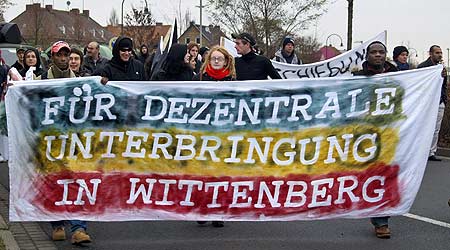 Abolish! Demo gegen AsylgesetzeZum Abschluss einer "Abolish-Kampagne" gegen rassistische Sondergesetze für Flüchtlinge demonstrierten rund 600 Menschen am 11. Juni gegen die Residenzpflicht und das Asylbewerberleistungsgesetz. Die Demonstration startete an der EU-Vertretung vor dem Brandenburger Tor mit Redebeiträgen zu Frontex und Menschenrechtsverletzungen an den EU-Außengrenzen und mit Livemusik von Mal Élevé (Sänger von Irie Révoltés). Die Route führte entlang der Friedrichstraße zur Mohrenstraße (an der mit entsprechendem Gemüse auf eine längst fällige Namensänderung hingewiesen wurde) hin zum Sozialministerium. Dort wurde besonders die skandalöse medizinische Versorgung und die Leistungen nach dem Asylbewerberleistungsgesetz angesprochen, die unter dem Existenzminimum liegen. Schließlich gings über den Potsdamer Platz zum Tiergarten. Alles in allem eine laute, bunte Demo am richtigen Ort. Es wurde auch drauf geachtet, alle Redebeiträge mindestens zweisprachig zu halten, leider wurden die Zwischenkundgebungen dadurch ziemlich lang. Vor 15 Jahren wurde das Grundrecht auf Asyl in Deutschland faktisch abgeschafft. Im Juli 1993 führte der Bundestag die sog. "Drittstaatenregelung" und das Konzept der "sicheren Herkunftsländer" ein. Seitdem können Menschen, die in ihrem Herkunftsland zwar politisch verfolgt werden, aber über einen "sicheren" Drittstaat einreisen, ihr Recht auf Asyl nicht mehr geltend machen. Sie werden in das angeblich "sichere" Land zurückgewiesen. |