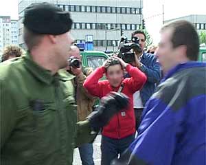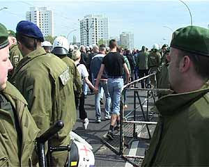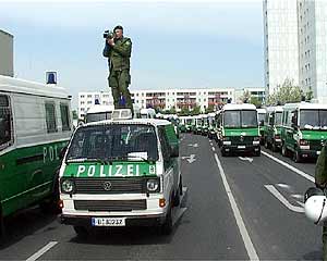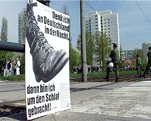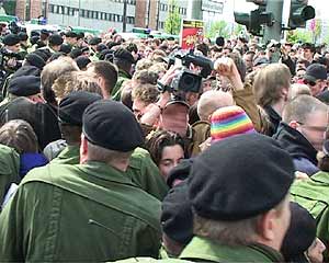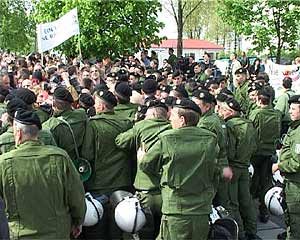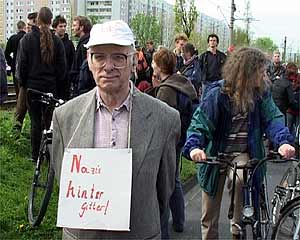 Zwei Gegenkundgebungen waren angemeldet: Prerower Platz/Lindencenter und Falkenberger Chaussee/ Prendener Str.. Letztere wurde verboten, da sie auf der von der Polizei für den NPD-Aufmarsch gesperrten Seite entlang der S-Bahn stattfinden sollte. Dennoch gelangten etwa 400 AntifaschistInnen durch die Einladung einer Kirchengemeinde dorthin und konnten den Beginn der NPD-Demo für über eine Stunde blockieren. Danach drängte die Polizei sie ab und ließ die NPD-Demonstration stundenlang durch Hohenschönhausen marschieren. siehe auch: Bericht aus Hohenschönhausen vom 30. April 23.30 Uhr | ![]() |