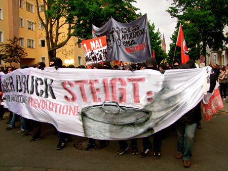 1. Mai 2012 in BerlinMit über 20.000 Teilnehmenden war die diesjährige revolutionäre 18 Uhr-Demonstration eine der best besuchtesten der letzten Jahre. Neben kapitalistischer Krise, Gentrifizierung, CDU/SPD- Stadtregierung und Polizeigewalt war sicherlich auch das gute Wetter daran nicht ganz unschuldig. Auch die Tatsache, dass kein MayDay in Berlin organisiert wurde, trug dazu dabei, dass dieses Mal alle zum Lausitzer Platz nach Kreuzberg kamen, wo die Demo startete. Nach einem etwas langatmigen