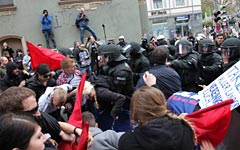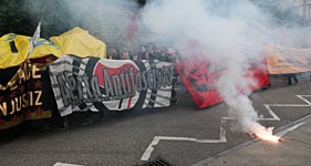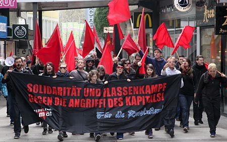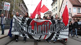 1. Mai 2013 in StuttgartAn der anschließenden Demo beteiligten sich etwa 700 Menschen. Mit festen Reihen im vorderen Bereich, vielen Schildern, Fahnen und Transparenten zog die Demo Richtung Stuttgart Heslach. Unterwegs gab es Redebeiträge, unter anderem zu den Themen Antimilitarismus, Frauenkampf und Repression. Es wurden mehrere Rauchkörper gezündet und zeitweise ein Top-Transpi über dem vorderen Bereich der Demo mitgeführt. Kurz vor Erreichen des Marienplatzes wurde der Demozug von der Polizei gestoppt und angegriffen. Die Polizei versuchte dabei Transparente zu beschlagnahmen. Bei dem Angriff wurde seitens der Polizei Pfefferspray und Schlagstöcke eingesetzt, wordurch es zu verletzten DemonstrantInnen kam. Die Demosanitäter berichteten von insgesamt etwa 20 Verletzten, neben den Verletzungen durch Schlagstockeinsatz hauptsächlich durch Pfefferspray, das die Polizei in den vorderen Teil des Demozuges gesprüht hatte. Außerdem wurde eine Rückenverletzung sowie mehrere Prellungen, v.a. an Händen und Beinen, gemeldet. Bei der Versorgung von Verletzten wurden die Demosanitäter mehrfach durch Polizisten behindert. Nach einiger Zeit konnte die Demonstration fortgesetzt werden, allerdings zum Teil in einem Wanderkessel und ab dem Marienplatz in einem Spalier und einer permanenten Polizeikette vor dem Haupttransparent. Vom Abschlusskundgebungsplatz auf dem Erwin-Schöttle Platzwurde noch eine kurze Demo bis zum Fest im Linken Zentrum Lilo Herrmann durchgeführt, wo der Tag schließlich mit einem Polit- und Kulturprogramm zu Ende ging. - Thomas Trueten -