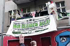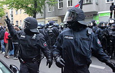 die Demonstration in aggressiver Weise in einem engmaschigen Spalier begleitete.
