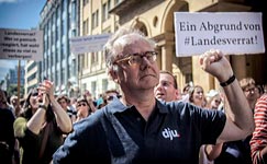 "Bildet Landesverräter Banden!"Die beiden Journalisten von Netzpolitik.org, Markus Beckedahl und Andre Meister, hatten über Pläne des Bundesamtes für Verfassungsschutz berichtet, Internet-Netzwerke stärker zu überwachen. Dazu veröffentlichten sie geheime Unterlagen des Verfassungsschutz. Der erstattete daraufhin Anzeige, der Generalbundesanwalt leitete Ermittlungen ein. Nach neuesten Meldungen erklärte die Bundesanwaltschaft allerdings mittlerweile, das Verfahren ruhen zu lassen. Nun solle erstmal geklärt werden, ob mit dem Bericht überhaupt Staatsgeheimnisse verletzt wurden. |