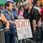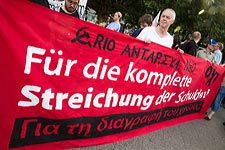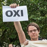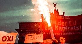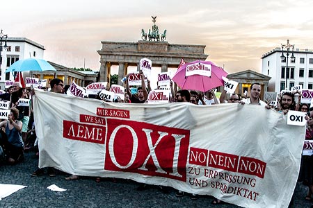 Nein! Oxi! No! zur SparpolitikRund 2000 Menschen demonstrierten am 3.7.2015 in Berlin anläßlich des geplanten Referendums in Griechenland unter dem Motto "Nein! Oxi! No! zur Sparpolitik - Ja zur Demokratie!" Zu Beginn der Demonstration, die am Oranienplatz startete, kam es zu zahlreichen Festnahmen, als die Polizei ein Transparent "Deutschland, du mieses Stück Scheiße" wegen Beleidigung beschlagnahmte. |