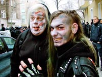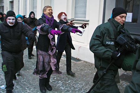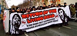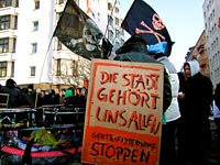 | Liebig 14 - Return of the living dead"Kein Ende mit Schrecken, sondern Schrecken ohne Ende!" Mehr als 1.500 Menschen zogen am 4. Februar 2012 mit einer Zombieparade quer durch Friedrichshain und protestierten gegen die Räumung der Liebigstrasse 14 vor einem Jahr. Als Zombies geschminkt forderten sie ein Ende der Gentrifizierung bestimmter Stadtteile und drückten ihre Solidarität aus mit weiteren bedrohten Projekten. So befürchtet z.B. der "Schokoladen" in der Ackerstraße in Mitte eine Räumung am 22. Februar und ruft dringend zur Unterstützung auf, um das zu verhindern. Treffpunkt ist am 22.2 um 8 Uhr morgens vor dem Laden. Die Zombie-Demo, die von einem Großaufgebot Polizei begleitet wurde, endete in der Rigaer Straße/Ecke Proskauer. Die Liebigstraße selbst war weiträumig abgesperrt. |