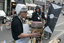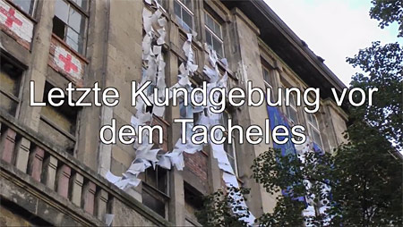 Räumung des TachelesMit der Übergabe des Hausschlüssels an den Gerichtsvollzieher durch Martin Reiter, den Vorsitzenden des insolventen Tacheles-Vereins, ging am Morgen des 4. September 2012 vergleichsweise leise eine Ära zu Ende. In der Kaufhausruine an der Oranienburger Straße war in den Neunziger Jahren ein selbstverwaltetes Kunsthaus entstanden. Nachdem der Investor, der Haus und Gelände 1998 gekauft hatte, in Zahlungsschwierigkeiten geraten war, stand das Tacheles seit 2007 unter Zwangsverwaltung durch die HSH Nordbank. Ein Teil der Nutzer verließ seitdem gegen Abfindung das Haus, die verbleibende Gruppe wollte sich gegen die Räumung zuletzt nicht mehr zur Wehr setzen. Viele haben bereits neue Ateliers gefunden. (siehe taz-Bericht) Unser Kollege Christian