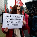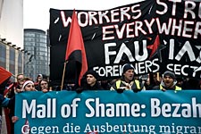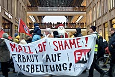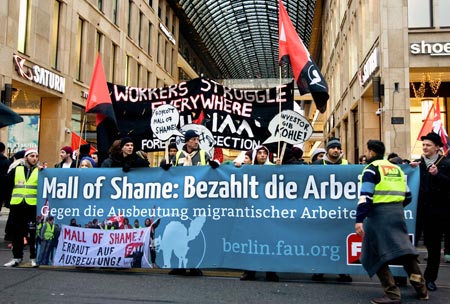 Mall of ShameAm Samstag den 6. Dezember 2014 hat eine Solidaritätsdemo mit den Arbeitern der Mall of Berlin stattgefunden. Die Arbeiter informieren seit einer Woche vor dem Einkaufscenter am Leipziger Platz über ihre Situation. Die Mall of Berlin ist als Mall of Shame ein Symbol für die Ausbeutung rumänischer Leiharbeiter geworden. Die rumänischen Arbeiter waren über die Subunternehmen Metatec Fundus Gmbh und Openmallmaster Gmbh eingestellt worden und sind teilweise nicht bezahlt worden, bzw. haben für Stundenlöhne von fünf bis sechs Euro gearbeitet. Sie werden von der FAU unterstützt und durch die Demo mit ca. 300 Menschen am Samstag, die mehrmals um das Einkaufsquartier zogen und die Weihnachtseinkäufer*innen über die Ausbeutungsbedingungen beim Bau des Einkaufscenters informierten. Außerdem ging die Demo beim Investor dieses Projekts Huth am Potsdamer Platz 5 vorbei. |