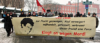 Oury Jalloh Demonstration 2016Anlässlich des 11. Todestages von Oury Jalloh, der am 7. Januar 2005 durch einen beispiellos brutalen und menschenverachtenden Brandmord im Dessauer Polizeigewahrsam sterben musste, versammelten sich ca. 250 Menschen in trauerndem, wütendem und forderndem Gedenken in der Stadt der rassistischen Täter - Dessau-Roßlau. Ein Bericht von Thomas Ndindah von der Initiative in Gedenken an Oury Jalloh. Nach der letztjährig bisher größten Demonstration zum 10. Todesjahr, an der ca. 1000 Menschen in Dessau erschienen waren, hat die Initiative in Gedenken an Oury Jalloh ihre Aufklärungsarbeit auch im Jahresverlauf 2015 konsequent fortgesetzt und Ende Oktober neue internationale Gutachten zur manipulierten Aktenlage von Staatsanwaltschaft und Gerichten vorgestellt. Weitere Höhepunkte des letzten Jahres mit weitreichender Öffentlichkeitswirksamkeit waren der NDR-Tatort "Verbrannt", dessen fiktiver Plot auf dem wahren Fall Oury Jalloh basierte sowie ein Monitor-Beitrag vom 15.10.2015. Im Gegensatz zum vollmundig-verlogen angekündigten "Aufklärungsbedarf(!)" des Leitenden Oberstaatsanwaltes Folker Bittmann nach dem 2013 vorgestellten Brandgutachten kann die Staatsanwaltschaft Dessau-Roßlau bis zum heutigen Tag keinerlei neue oder zielführende Erkenntnisse im "laufenden" Todesermittlungsverfahren vorweisen - womit sie ihre vom ersten Tag an praktizierte, haltlose Strategie der "Schuldzuweisung" an das Todesopfer unter anhaltender Vertuschung und aktiver Manipulation der Fakten des Falles unverändert beibehält. Der Trauerzug erinnerte