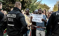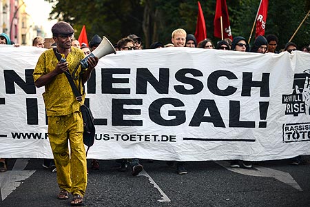 der Refugees in Slogans, Liedern und Parolen auf die Straße. Der