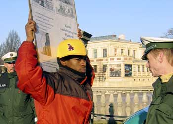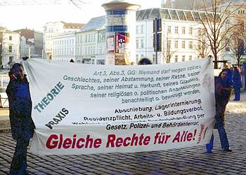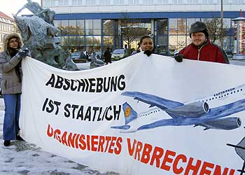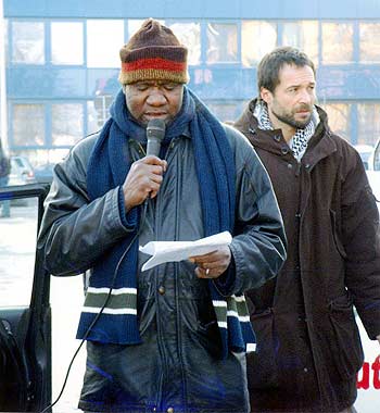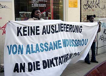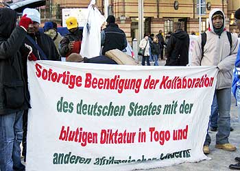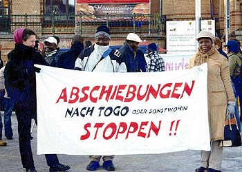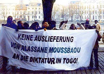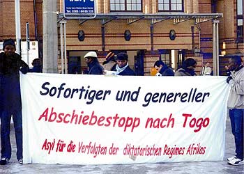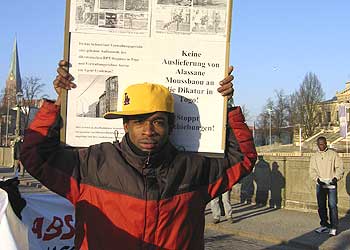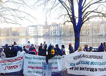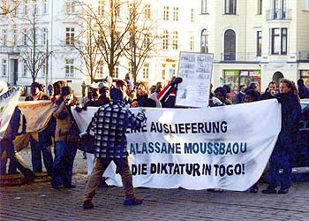 Keine Auslieferung von Alassane Moussbaou an die Diktatur in Togo!Seit dem 2. Dezember 2005 befindet sich der togoische Regimegegner Alassane Moussbaou in der JVA Bützow (Mecklenburg-Vorpommern) in Abschiebehaft. Alassane ist Aktivist der "Internationalen Kampagne gegen die Diktatur in Togo und anderen Afrikanischen Ländern". Ein erster Abschiebungsversuch ist am 10. Januar '06 an seinem Widerstand gescheitert. Trotz einer breiten Kampagne, Intervention des UNHCR und der Forderung des Petitionsausschusses in Mecklenburg-Vorpommern seine Abschiebung auszusetzen, halten die Behörden und das Innenministerium daran fest, Alassane an die Diktatur in Togo auszuliefern. Die selbe Gefahr droht mehreren hundert Flüchtlingen, die aus dem SPD-PDS geführten Mecklenburg-Vorpommern in nächster Zeit nach Togo abgeschoben werden sollen. Am 9. Januar fand eine Kundgebung in Schwerin statt (siehe Fotos rechts), eine weitere Protestaktion ist für den 19. Januar vor der Landesvertretung Mecklenburg-Vorpommern in Berlin geplant. Ort: In den Ministergärten 3, Treffpunkt: 12 Uhr Potsdamer Platz, Ecke Leipzigerstr. / Ebertstr.  |