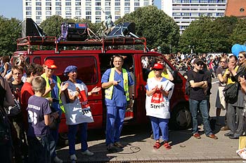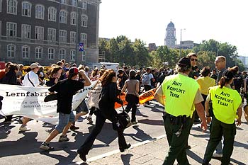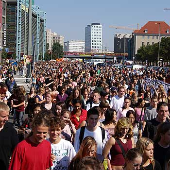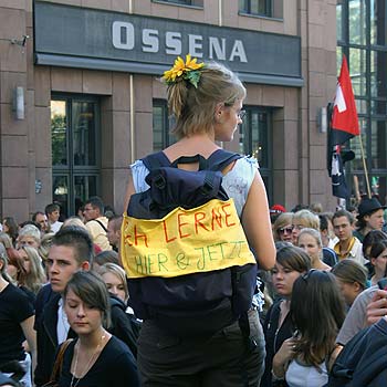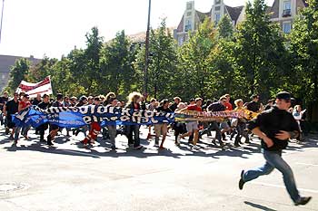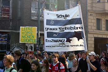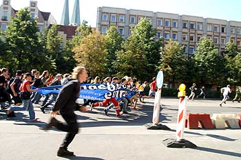 die ganze Wegstrecke über zu hören. Über den Hackeschen Markt ging es die Rosenthaler Straße entlang bis zur Torstraße, weiter über die Mollstraße, Otto-Braun-Straße, Grunerstraße und wieder auf die Spandauer und zurück zum Roten Rathaus. Unterwegs wurde auf jeder Kreuzung und zwischendurch immer mal wieder ein Stopp eingelegt und wieder waren recht gute und informative Redebeiträge dabei! Kritisiert wurden vor allem Lehrermangel, Unterrichtsausfall sowie die hohen Kosten für Schulbücher und Studiengebühren.Thematisch wurden Zusammenhänge zwischen Bildungspolitik, Privatisierungen und Neoliberalismus aufgezeigt und immer wieder darauf verwiesen, dass es sich lohnt aufzustehen und was zu tun!!! Nach etwa 2/3 der Strecke wurde bekannt, dass es eine Festnahme zu beklagen gab. Es wurden wohl Wahlplakate beschädigt. Schon einige Zeit vorher begann die Polizei damit im Spalier zu laufen, was teilweise mit Sprechchören "Haut ab! Haut ab!" seitens der Demo kommentiert wurde. Auch sorgte ein Beamter mit einer Videokamera permanent für Unmut. Viel Spass beim Stinkefinger zählen kann man den Menschen nur wünschen die das Band auswerten. Viel mehr wird wohl kaum erkennbar sein. Zum Ende hin gab es 2, 3 super Sprinteinlagen bei denen die Beamten (insbesondere die vom sogenannten Anti-Konflikt-Team) regelrecht überrannt wurden. Gut erkennbar war wieder einmal wie schnell sich die Polizei aus dem Konzept bringen lassen kann. Vor dem Roten Rathaus fand die Abschlusskundgebung dann nur noch mäßigen Zuspruch, weil viele sich mit Lebensmitteln versorgten. Eine Verdi-Abordnung vom Charité-Streik kam vorbei um solidarische Grüße zu übermitteln und ein Sprecher vom Aktionsbündnis gegen Studiengebühren meldete sich auch noch zu Wort. Zum Abschluß der Kundgebung gab es ein Konzert mit Ska- und Hiphopgruppen. - Mike - |