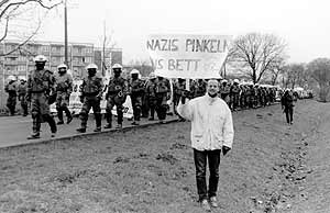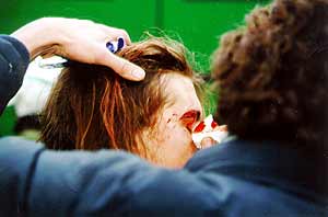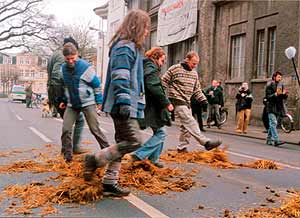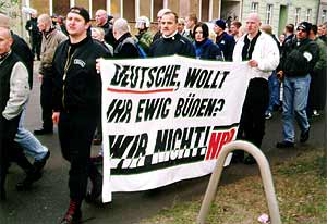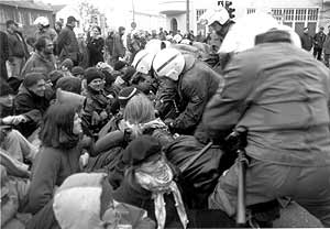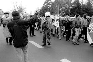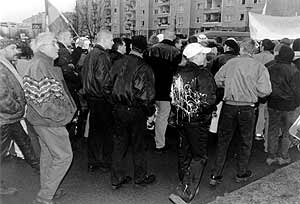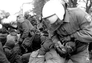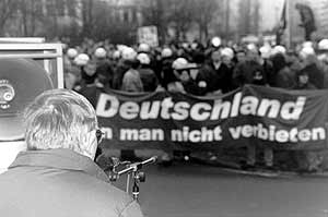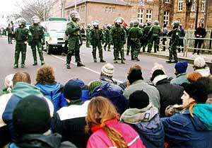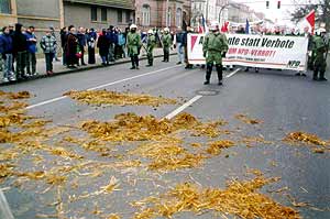 NPD-Aufmarsch in Greifswald7000 Menschen kamen zu ProtestaktionenIm November letzten Jahres wurde bekannt, daß der NPD-Kreisverband Greifswald im Januar eine Demonstration veranstalten will. Das war insofern eine besondere Sache, da in Greifswald bis dato noch kein NPD-Aufmarsch stattgefunden hatt (im Gegensatz zu allen anderen Städten in Mecklenburg-Vorpommern) und zusätzlich im letzten Jahr zwei Obdachlose in Greifswald ermordet wurden. Beide Male kamen die Täter aus rechtsradikalen Kreisen. Dementsprechend war die Empörung groß und überraschenderweise fand sich eine breite Front von politischen Gruppierungen (von Antifa bis Universität und CDU) zusammen. Eine große Demonstration unter dem Motto "Aufstehen gegen Menschenverachtung" und ein "Rock gegen Rechts"-Konzert am Abend sollte stattfinden. Inhaltlich den kleinsten gemeinsamen Nenner zu finden war wie zu erwarten schwierig und er fiel entsprechend klein aus. Für viele Leute war schon im Vorfeld klar: lustig Gegendemo machen reicht uns nicht. | ![]()