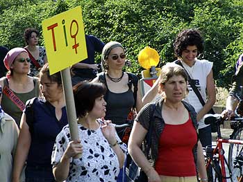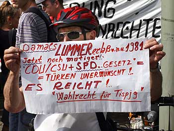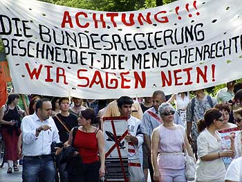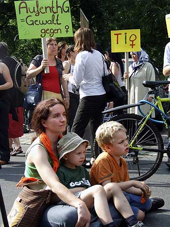 des Zuwanderungsgesetzes zu demonstrieren.  Statt einer Bleiberechtsregelung wurden an diesem Tag im Bundestag zahllose Verschärfungen beschlossen: die Erschwerung des Familiennachzugs, die Erschwerung der Einbürgerung für junge MigrantInnen, Sanktionen bei Nichtteilnahme an Integrationskursen, verminderter Leistungsbezug auf vier Jahre für nicht anerkannte Flüchtlinge, verschärfte Ausweisung und vieles mehr. Zahlreiche Gruppen hatten zu der Demo aufgerufen: u.a. der Flüchtlingsrat Berlin, JoG (Jugendliche ohne Grenzen), Initiative gegen das Chipkartensystem, Bündnis gegen die Migrationspolitik der G8, und zahlreiche ExpertInnen aus dem Migrations- und Flüchtlingsbereich. Die Demo stand im politischen Kontext zu den Kämpfen in Rostock und Heiligendamm, wo am Migrationstag am 3. Juni 2007 über 9 000 Menschen auf die Straße gegangen sind, um ihren Forderungen Ausdruck zu verleihen: Für globale Bewegungsfreiheit. Keine Sondergesetze. Bleiberecht für alle. Wir sind hier weil ihr unsere Länder zerstört. Der Kampf geht weiter - jetzt erst recht! - Doro - |