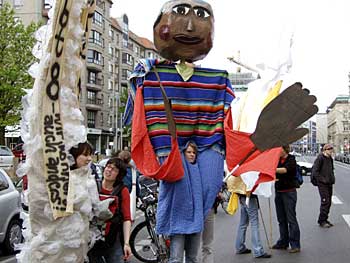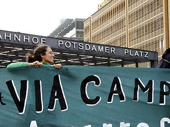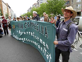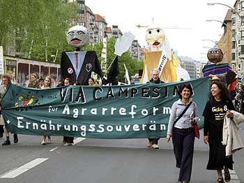Bauern und Bäuerinnen, Landlose, LandarbeiterInnen und Indigene haben es immer schwerer von ihrer landwirtschaftlichen Arbeit zu (über-) leben, im Süden wie im Norden. Ihnen wird auf allen Ebenen, wo es nur geht, die Luft zum Atmen genommen. Oder genauer gesagt: ihnen wird der Boden zum Anbauen, das Saatgut zum Aussähen, das Wasser zum Gießen und der Markt zum Verkaufen genommen. Hauptursache dafür ist die herrschende neoliberale Politik, die einseitig die sowieso schon sehr stark konzentrierte Macht der Agrarkonzerne und Großproduzenten weiter fördert. Der Anbau, die Weiterverarbeitung und der Handel liegt so zunehmend in den Händen von wenigen. Diese Entwicklung zerstört nicht nur kleine ProduzentInnen, sondern führt auch zu einer gefährlichen Abhängigkeit in der weltweiten Nahrungsmittelversorgung. Via Campesina, ein weltweiter Zusammenschluß von über 140 kleinbäuerlichen Basis-Organisationen, kämpft gegen diese zerstörerische Politik und für eine andere Landwirtschaft entsprechend ihrem Konzept der Ernährungssouveränität. (www.viacampesina.org) Hier noch ein Auszug aus dem Aufruf von Via Campesina zu ihrem weltweiten Aktionstag: ..."Erteilen