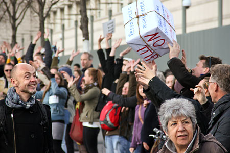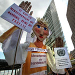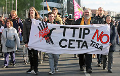 Internationaler Aktionstag gegen TTIPBei einem weltweiten Aktionstag gegen das Freihandelsabkommen TTIP gingen am 18. April 2015 Zehntausende auf die Straße. Allein in Deutschland gab es Aktionen in rund 200 Städten. In Berlin beteiligten sich über 1000 Menschen an einer Menschenkette vom Potsdamer Platz zur US-Botschaft am Brandenburger Tor. Anlass für den Aktionstag war die mittlerweile neunte Verhandlungsrunde zum TTIP-Abkommen zwischen USA und EU, die ab dem 20. April in New York stattfand. |