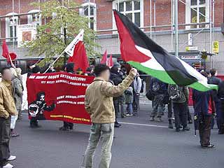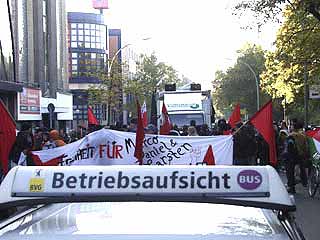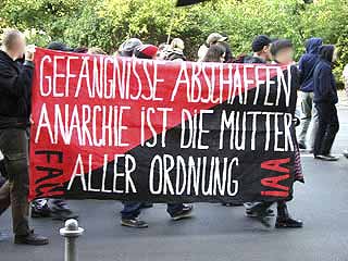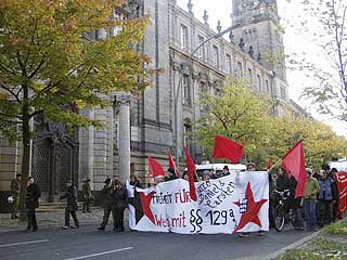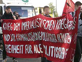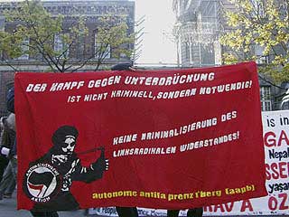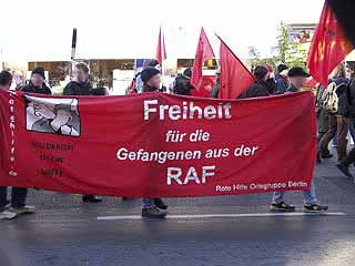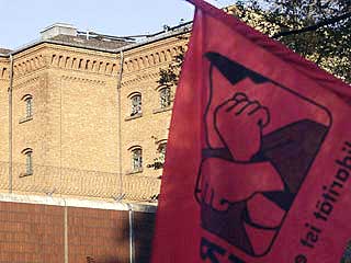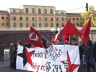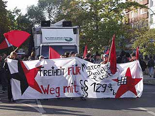 "Freiheit für Daniel, Marco und Carsten! Weg mit dem Paragraf 129a/b"Auf der Demonstration durch den Berliner Stadtteil Moabit drückten ca. 300 TeilnehmerInnen ihre Solidarität mit den Magdeburger Gefangenen aus und forderten ihre Freilassung. In Redebeiträgen wurde an die Rolle des früheren linken Anwalts und heutigen Innenministers Otto Schily erinnert, sowie die Lage von politischen Gefangenen in aller Welt kritisiert. Die Demo führte am Innenministerium, dem Kriminalgericht - wo immer noch der RZ-Prozess läuft - und dem Knast Moabit vorbei, vor dem auch eine Abschlusskundgebung mit viel Musik stattfand. Einige Gefangene konnten das aus ihren Zellenfenstern mitverfolgen. Am 25.10. wird in
