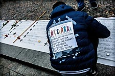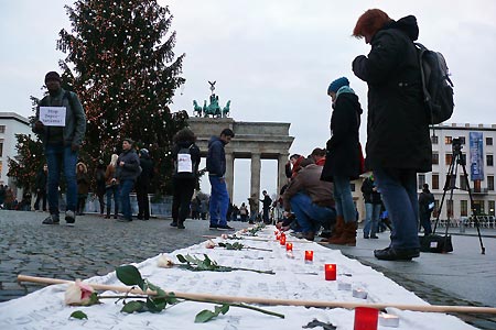 Internationaler Tag der MigrationAm 18. Dezember, dem Internationalen Tag der Migration, versammelten sich ca. 100 Menschen am Pariser Platz vor dem Brandenburger Tor, um der Geflüchteten, die durch das europäische Grenzregime getötet wurden, zu gedenken. In Wut und Trauer wurden an einem 80 Meter langen Banner mit den Namen der seit 1993 in der BRD gestorbenen 548 Flüchtlinge Kerzen aufgestellt und Blumen niedergelegt. Zum Internationalen Tag der Migration, der im Jahre 2000 von der Generalversammlung der UNO auf den 18. Dezember festgelegt wurde, fanden auch dieses Jahr Kundgebungen in anderen europäischen Städten, auch in afrikanischen Ländern wie Mali und Togo statt. An den europäischen