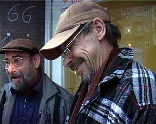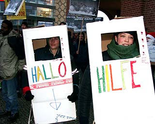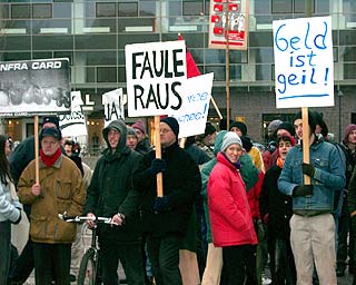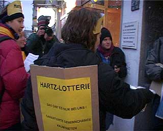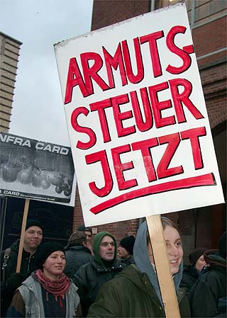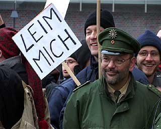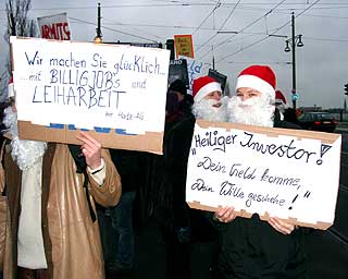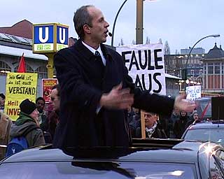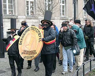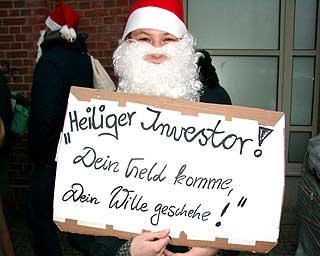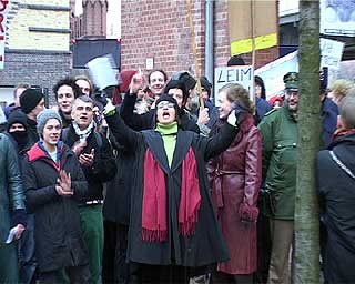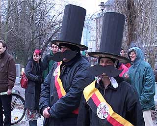 Der Investor kommtTage des sozialen (Un)gehorsams in BerlinZu der entstehenden "Spree-City" zwischen Warschauer Strasse und Ostbahnhof kam am 19. Dezember nachmittags hoher Besuch: "Der Großinvestor" sprach an der Oberbaumbrücke (Ostseite) bei "Universal Musik" zu etwa 200 hörigen AnhängerInnen: "Hinter mir die Oberbaumcity. Ihr seht ein völlig neues Stadtquartier, 60 Meter hohe Hochhäuser. Ihr seht eine Mehrzweckhalle für 18000 Personen, ihr seht pulsierendes Leben, ihr seht Eigentumswohnungen im Hochpreissegment, ihr seht etwas, wo ihr nichts zu suchen habt." So der Investor stilecht im schwarzen Anzug und schwarzer Daimlerkarosse. Eine gelungene Werbeaktion von "fels" und unabhängigen Gruppen für das dahindarbende Berlin, wenn, ja wenn es nicht zu diesem traurigen Ende gekommen wäre... Aber seht selbst unten im Video (5.30 Min, mp4) |