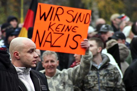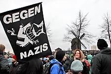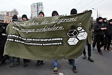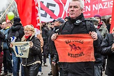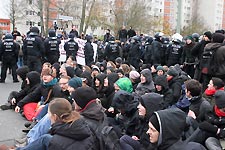 "Keine Nazis" in Marzahn erfolgreich blockiert!In Marzahn soll Anfang 2015 ein Containerlager zur Unterbringung von Geflüchteten eröffnet werden. Ein Netzwerk aus "Nationaler Widerstand Berlin", NPD und "Die Rechte" nutzt dies, um lokale BFC-Hooligans, 'ganz normale' und offen rassistische Anwohner*innen gegen dieses Vorhaben zu mobilisieren. Nach mehreren Montagsdemonstrationen versammelten sich die Nazis am 22. November erneut in Marzahn dieses Mal mit überregionaler Unterstützung. Allerdings kamen sie nicht weit: ein breites Bündnis aus antifaschistischen Gruppen und Initiativen mit insgesamt mehr als 3.000 Menschen stellte sich ihnen entgegen und verhinderte den Aufmarsch mit Blockaden. |