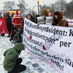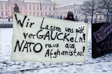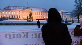 Keine Abschiebungen nach Afghanistan!Der bayernweite Aktionstag "Keine Abschiebungen nach Afghanistan! Bleiberecht jetzt!" fand in Berlin solidarische Unterstützung. 60 AktivistInnen unterstützten die Forderung mit einer Kundgebung vor dem Sitz des Bundespräsidenten Joachim Gauck und unterstrichen, dass die katastrophale wirtschaftliche und politische Situation in Afghanistan keine Sicherheit für dort lebende Menschen bietet. Selbstmordattentate, Bombenanschläge, militärische Gefechte und Luftangriffe sind deutliche Hinderungsgründe, 3000 Flüchtlinge nach Afghanistan abzuschieben. Die Lebensbedingungen und Asylregelungen in Deutschland sind ein wichtiges Thema, noch wichtiger ist den AktivistInnen, dass die Menschen nicht in ein Land abgeschoben werden, das keine Sicherheit für das Leben der Menschen bietet. Die Demonstration verlief friedlich und ohne Zwischenfälle. |