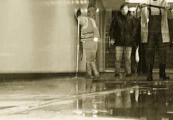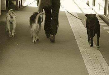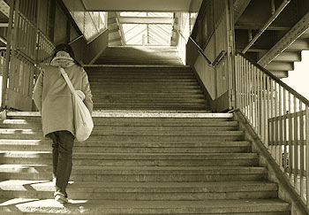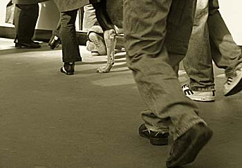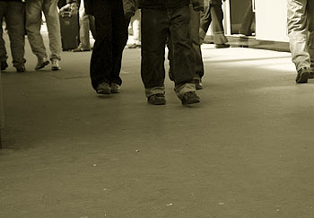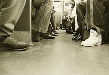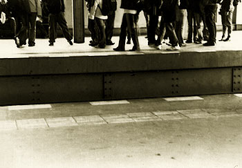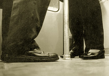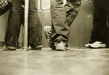 Unzählbar sind die täglichen Urteile und Verbalattacken gegen Mitmenschen ohne nur einen Gedanken an das ihrige Schicksal zu verschwenden - und das alles auf Grundlage eines zusammenhanglosen Kontakts, einer Impression, eines zufällig auf eben diesen gefallenen Blick. Ebenso vielköpfig die Urteile und Spekulationen über diese und jene Biographie, die diesem und jenem all ihre Verfehlungen und Auslassung im Leben diagnostiziert - und das alles auf Grundlage eines... Andererseits gibt es Menschen die kontaktfreudig auf andere zugehen, immer bereit sind für ein zwar kurzes, aber symphatisches Gespräch; echtes Interesse zeigen an den Dingen, die um sie herum geschehen. An dieser Stelle einen Gruß an die nette Punkerin, die sich sofort angeboten hatte, für mich zu Posieren. Was könnte also ein Motiv sein, dass frau sich, mit Kamera gerüstet, in genannten Gefilden auf fotographisches Weidwerk nach der ursprünglich einzigen Transportmöglichkeit des Menschen macht: Füße und Beine. Vielleicht um einfach nur die Erfahrung zu machen, dass die große Mehrheit sich zu empören versteht, in den Winkel ihres aufleuchtenden Blitzes geraten zu sein, aber dennoch nicht an einer einzigen, ja simplen Erklärung Interesse zeigen, in diesem Falle gar taube Ohren in Perfektion beweisen und wild gestikulierend unterstreichen, es ohnehin besser wissen zu müssen. Nun, vielleicht gibt es aber auch gar kein Motiv, vielleicht war es auch einfach ein intuitiver Einfall ohne Hintergedanken, den Anschein erweckend, es sei lohnenswert, ihm nachzugehen und im Handeln selbst weiterzuentwickeln. Die Erfahrungen, die sich beim tagtäglichen Wandel durch unterirdische Marschwege des Menschen, das Objektiv stehts auf aller Körperteile unterhalb der Taille gerichtet, sammeln ließen, sind - mir zumindest - Ergebnis genug. Es sei hier jedem selbst überlassen, über das dokumentarische Ergebnis der Fotographien zu urteilen - oder auch nicht." - Agnes Manka - |