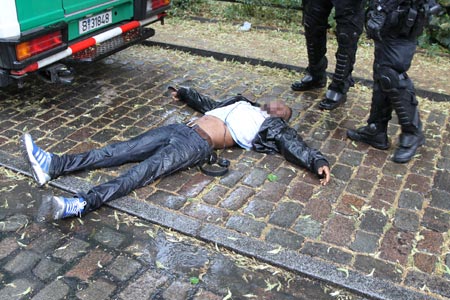 der Demonstranten gebracht. Dort wurde er von den Polizisten maltraitiert