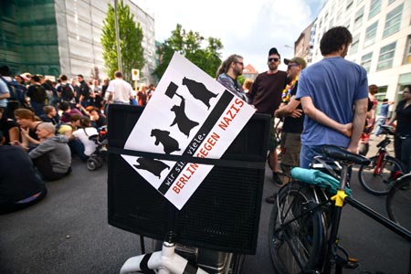 Ein lautes Konzert aus Pfiffen und "Naziraus" - Rufen schlug den Rechten entgegen, als sie am Mittag an der Jannowitzbrücke eintrafen. Angemeldet von der Berliner NPD um Schmidtke und Frank, waren zudem Neonazis wie Uwe Dreisch von "Die Rechte" vor Ort, und auffällig war, dass sogar extra aus Dortmund Demonstranten angekarrt werden mussten, wie der braungebrannte "SS-Siggi" Siegfried Borchardt mit seinem seltsamen blonden Bärtchen. Nachdem aufgrund eines Angriffs auf der Hinfahrt aus dem blauen Transporter der Berliner NPD heraus, dieser durchsucht wurde und einige Festnahmen stattfanden und auch während der Auftaktkundgebung ein weiterer Neonazi nach einer Hetzrede endete mit "Deutschland den Deutschen - Ausländer raus" und daraufhin wegen Volksverhetzung vorläufig festgenommen wurde, verzögerte sich der Start der Demonstration.