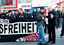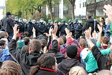 mit Blockaden. In kleinen Gruppen gingen die Rechten zurück zum Ausgangspunkt Grottkauer Straße, wo die angeblichen AnwohnerInnen kurzerhand in die U-Bahn einstiegen. Der harte Kern um den Berliner NPD-Chef Sebastian Schmidtke indes verblieb an Ort und Stelle, um eine neue Demonstration anzumelden, die zum U-Bahnhof Kaulsdorf Nord ziehen sollte. Noch bevor die neue Demonstration losziehen konnte, hatte sich erneut Widerstand formiert, und mehrere hundert AntifaschistInnen versuchten immer wieder, die Demonstrationsroute zu blockieren. Sie wurden jedoch, anders als zuvor, konsequent und massiv von Polizei beiseite geräumt. Dabei kam es zu zahlreichen Verletzungen und Festnahmen. |