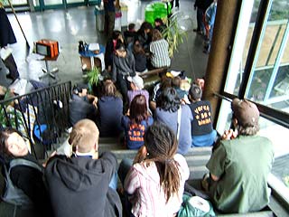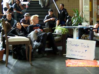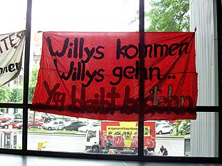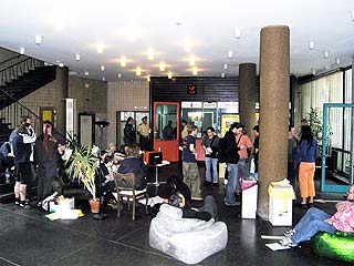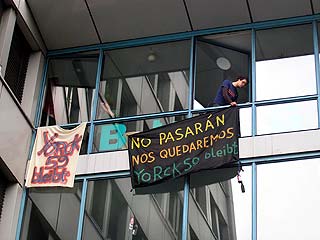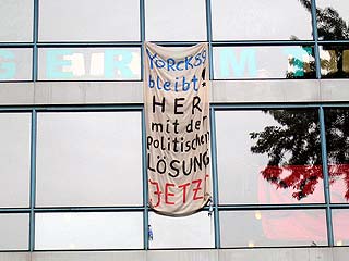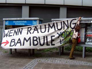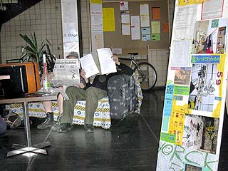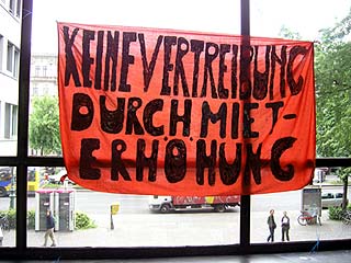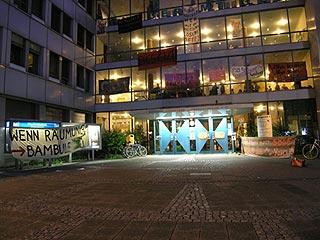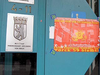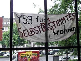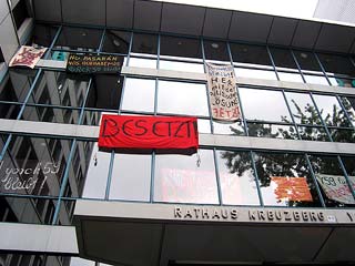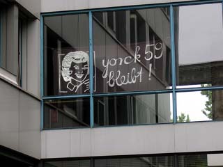 Rathaus Kreuzberg erneut besetztAm Montag den 30 Mai haben UnterstützerInnen des Projekts Yorck59 erneut das Kreuzberger Rathaus besetzt, um auf die Dringlichkeit einer politischen Lösung und die Verhinderung der für den 6.6. angekündigten Räumung hinzuweisen. Aus diesem aktuellen Anlass wird die Pressekonferenz der Yorck59 in das Rathaus Yorckstr. 4-11 auf 15.30 Uhr verlegt. Mit Sofa und Zimmerpflanzen ist eine Delegation der Yorck59, begleitet von UnterützerInnen ins Rathaus umgezogen: von der Yorckstr. 59 in die 4-11. Die neuen RathausbewohnerInnen fordern konkrete Schritte von Seiten der PolitikerInnen auf Landes- und Bezirksebene für eine politische Lösung, um eine Räumung des Projekts zu verhindern. Der Versuch den Hauseigentümer Marc Walter zu Verhandlungen zu bewegen, wurde in den letzten Wochen seitens der PolitikerInnen, die ansonsten verbal für den Projekterhalt eintreten, nicht unternommen. (weiter: siehe unten) |