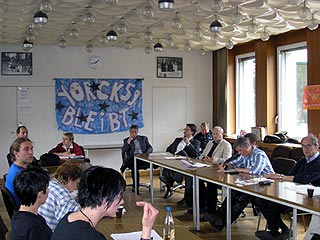 Besonders die Landes-SPD hat durch die Rücknahme ihrer Zusage vom 10.5., Walter zu einen Runden Tisch einzuladen, einem solchen Prozess blockiert (siehe Presseerklärungen vom 27.5. und 29.5.). Andererseits reagierte der Bezirk Friedrichshain-Kreuzberg auf den politschen Druck der Anti-Räumungskampagne mit der Vorlage einer Liste von Gebäuden, die sie dem Projekt Yorck59 als Ersatz-Standort anboten. Diese Immobilien sind jedoch für das Projekt Yorck59 in seiner ganzen Dimension unzumutbar, da sie weder bezüglich der Lage, Größe, Zustands, des Mietpreises und der Nutzungsmöglichkeiten den nötigen Anforderungen entsprechen und einen Projekterhalt gewährleisten würden. In einem Gespräch über diese Liste in der vergangenen Woche mussten selbst Bezirksbürgermeisterin Cornelia Reinauer und Baustadtrat Franz Schultz einräumen, dass die Vorschläge des Liegenschaftsfonds für die Yorck59 ungeeignet sind. Forderungen der BesetzerInnen: Die Bemühungen von PolitikerInnen auf Landes- und Bezirksebene, von SenatorInnen und Bundestagsabgeordneten sind noch lange nicht ausgeschöpft. Wir fordern von denen, die sich in der Vergangenheit für einen Projekterhalt aussprachen, sich am morgigen Dienstag an einem Runden Tisch im Kreuzberger Rathaus zu beteiligen. An diesem Tisch soll an einer konkreten politischen Lösung für den Projekterhalt der Yorck59 gearbeitet werden. Angesichts der für Montag nächster Woche angekündigten Räumung des Projekts ist ein Räumungsstop dabei unabdingbar. Die Räumung
