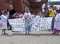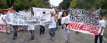 Demo für die Schließung des Flüchtlingslagers MöhlauAm 30.7.09 forderten rund 150 Menschen die Schließung des Lagers Möhlau in Sachsen-Anhalt und das Ende der rassistischen Behandlung der dort lebenden Flüchtlinge. Die Demonstration fand in Lutherstadt Wittenberg statt, in der sich die Kreisverwaltung mit der zuständigen Ausländerbehörde befindet. Die ehemalige, mittlerweile baufällige Kaserne liegt mitten im Wald und ist etwa 20 km von Dessau entfernt, wo sich die nächste Einkaufsgelegenheit befindet. 200 Menschen leben auf engstem Raum zwischen löchrigen Wänden, alten Möbeln, Kakerlaken und Ratten. Sie erhalten Gutscheine von 2 mal 66 Euro, müssen jeden Arztbesuch aufwändig beantragen und erhalten so gut wie nie Urlaubsscheine, denn auch für sie gilt die Residenzpflicht, nach der sie den Landkreis nicht ohne Genehmigung verlassen dürfen. Gegen einen Bewohner wurde vor kurzem für zweimaliges Verlassen eine Geldstrafe von 199 Euro verhängt. Am 14. Juli verstarb Azad M. an den Brandverletzungen, deren Ursachen bisher nicht geklärt sind. Aber erst dadurch wurde das alltägliche feindliche Klima und die Angriffe durch Deutsche auch in den Medien bekannt, denen die BewohnerInnen ausgesetzt sind. Am 16. Juli sollte um 4:10 h das Roma-Ehepaar Stolla in den Kosovo abgeschoben werden, erst nach der Selbstmord-Drohung von Herrn St. und dem Zusammenbruch von Frau St. wurde die Abschiebung ausgesetzt. Grundlage ist das Rückführungsabkommen, das Deutschland mit dem Kosovo abgeschlossen hat und seit Juni auch in Sachsen-Anhalt in Kraft getreten ist. | ![]()