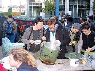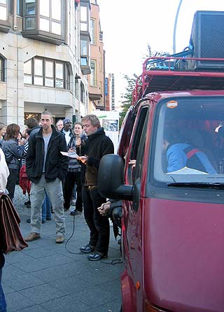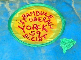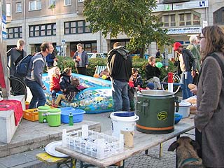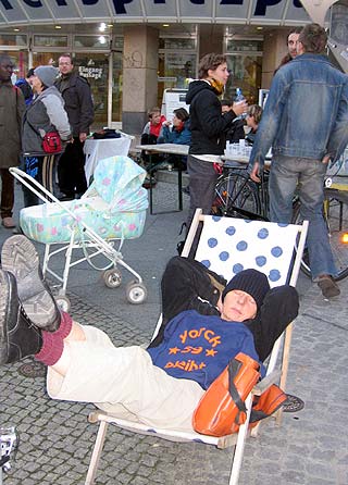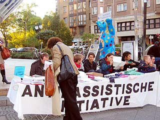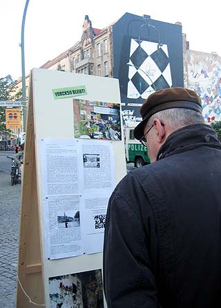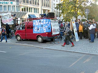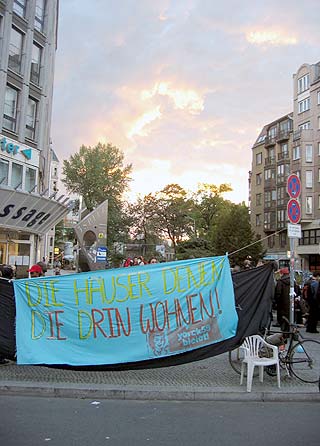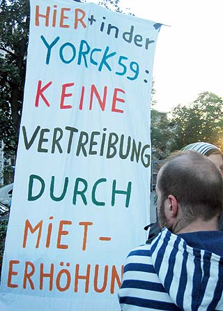 Yorck59 goes FriedrichstrasseAm Nachmittag des 30. September '04 fand in der Friedrichstr.129 / Ecke Claire Waldorfstrasse eine Kundgebung mit Infotischen, Quiz, Feuershow und Redebeiträgen statt. Ein weiteres Mal sollte die Öffentlichkeit darauf aufmerksam gemacht werden, dass das Hausprojekt Yorckstraße 59 akut bedroht ist, seit im Januar 2004 Marc Walter aus Hamburg das Haus kaufte. Die vier Fabriketagen wurden 1989 von einer Gemeinschaft linker Wohngruppen gemietet und ausgebaut um dort in kollektiver, solidarischer und selbstbestimmter Form zu leben und zu arbeiten. 60 Leuten im Alter von 0 bis 43, darunter 10 Kinder, bietet das Haus den Raum diese Vorstellung zu realisieren. Neben den großen Wohngemeinschaften gibt es dort auch Raum für politische und kulturelle Initiativen wie der Antirassistischen Initiative (ARI), dem Radioprojekt Onda, dem Infopool Lateinamerika Poonal, dem Anti-Hartz-Bündnis, diversen internationalistischen Gruppen, sowie Sport- und Theatergruppen und einem Atelier. In der Veranstaltungsetage findet jeden 1. und 3. Montag im Monat die DruzBar statt, dort gibt es leckeres Essen und Getränke zum Selbstkostenpreis. Außerdem finden regelmäßig Filmveranstaltungen, politische und kulturelle Veranstaltungen und Ausstellungen statt. Das Hausprojekt stellt einen wichtigen Teil der gewachsenen Infrastruktur für die Nachbarschaft und der linken (Sub-)Kultur dar. Yorck59 bleibt! |