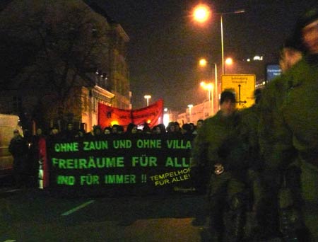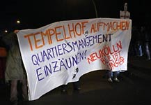 werden soll. In Redebeiträgen wurden die kommenden Einschränkungen für die Anwohner_innen in Vorbereitung einer Privatisierung des Flughafengeländes thematisiert. So existiert z.B. seit einigen Monaten unter der Leitung des Quartiersmanagements eine "Task Force Okerstraße". Dieses Konstrukt, das mit allen erdenklichen Behörden zusammenarbeitet und auch die Bevölkerung für Denunzitationszwecke einbinden will, hat sich zur Aufgabe gemacht, "Sauberkeit und Ordnung im Kiez" durchzusetzen. Defizil wird in ihrem "Strategiekonzept" beschrieben, wie gegen hier wohnenden "Trinker", Roma oder sonstigen "Saisonarbeiter vorwiegend aus Rumänien" vorzugehen ist. Das verkündete