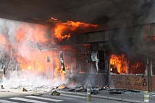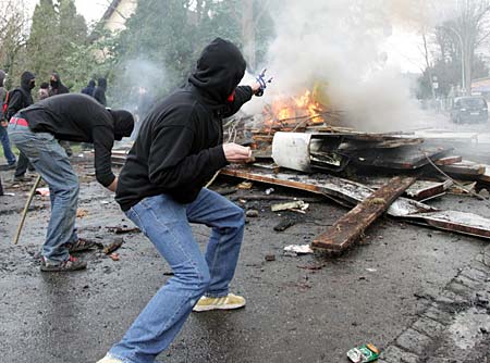 Demoteilnehmer, die Polizei mit Steinen, Urinflaschen und Anzünden