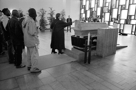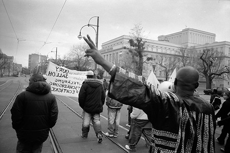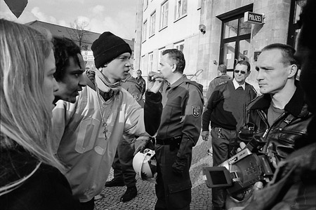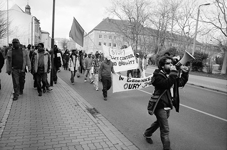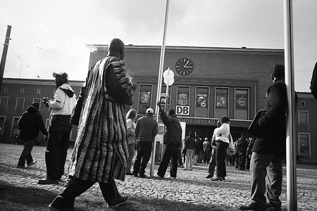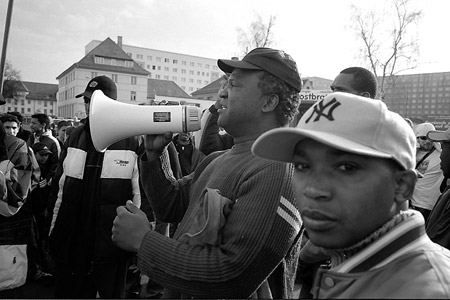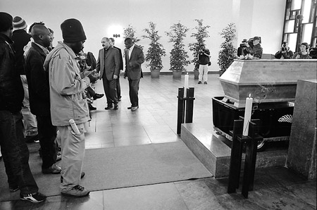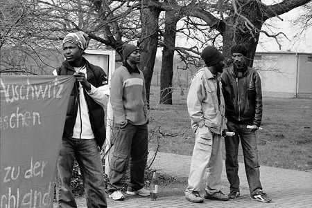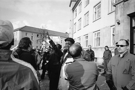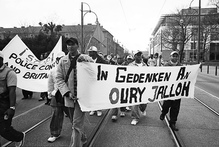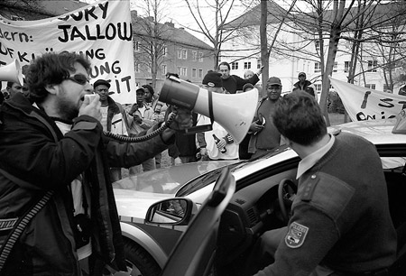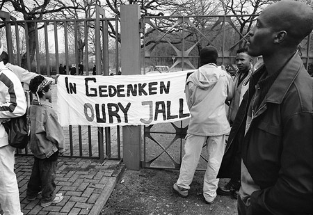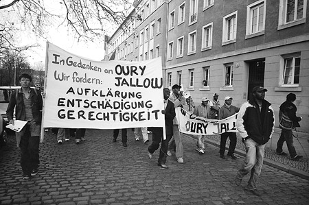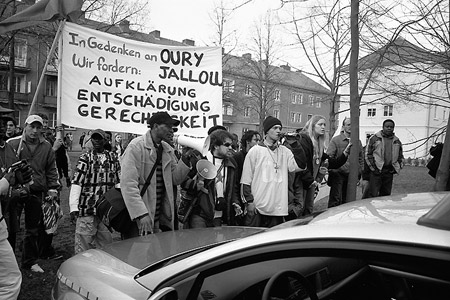 Am 7. Januar dieses Jahres kam Oury Jalloh auf einem Polizeirevier in Dessau (Sachsen-Anhalt) unter immer noch ungeklärten Umständen ums Leben. Zu seinem Gedenken versammelten sich am 26. März 2005 rund 200 Menschen. Im Anschluß an eine Trauerfeier auf dem Dessauer Zentralfriedhof formierte sich spontan ein Demonstrationszug zum Polizeirevier, um vor Ort gegen die Vertuschung der Todesumstände zu protestieren. Jalloh soll nach Informationen der ermittelnden Staatsanwaltschaft Selbstmord begangen haben, indem er die Matratze in seiner Zelle mit einem Feuerzeug anzündete und nach Ausbruch des Feuers einem Hitzeschock erlag. Der junge Mann aus Sierra Leone war allerdings zuvor von Polizeibeamten auf einer feuersicheren Pritsche »fixiert«, also an Händen und Füßen gefesselt worden. Gegen zwei beteiligte Beamte wird inzwischen wegen des Verdachts der fahrlässigen Tötung und gegen den Dienstgruppenleiter wegen schwerer Körperverletzung ermittelt. Untenstehend die ausführliche Erklärung der "Initiative in Gedenken an Oury Jalloh".
