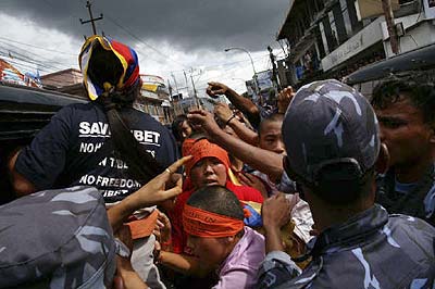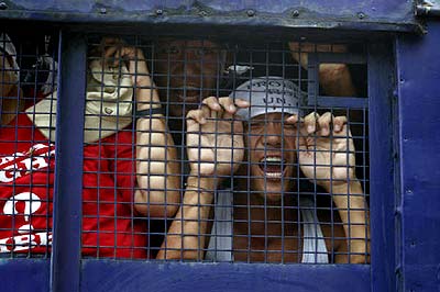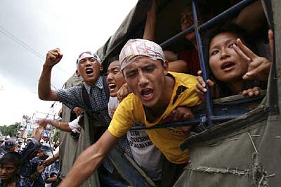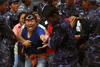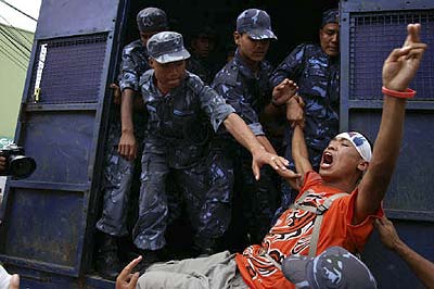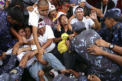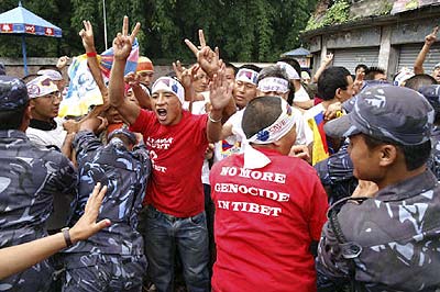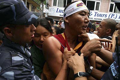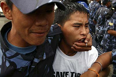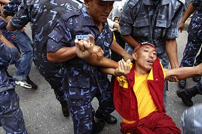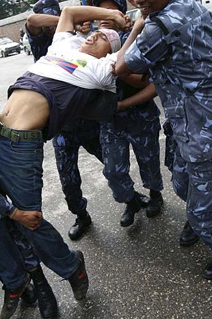 Die Exil-Tibeter in Nepal protestieren seit dem Frühjahr 2008 vor der Visaabteilung der chinesischen Botschaft in Kathmandu gegen das brutale Vorgehen der chinesischen Regierung in Tibet und für die Freilassung der inhaftierten Aktivisten. Die Polizei ging zu Anfang sehr brutal mit Knüppeln und Tränengas gegen diese Proteste vor. Dies veranlasste die EU und die USA zur Kritik an dem Vorgehen der nepalischen Behöden gegen die Exil-Tibeter. Die Proteste finden weiterhin fast alle 2 Tage statt und jedesmal werden sämtliche DemonstrantInnen verhaftet und auf brutale Weise abgeführt. Die Gewalt seitens der Polizei nimmt wieder zu und es sind vermehrt Fausthiebe und Tritte zu sehen. Der auf dem Foto zu sehende Dhatak wurde bei der Demonstration am 13. Juli 2008 von der Polizei schwer verletzt und musste ins Krankenhaus eingeliefert werden. Er war bisher bei jedem Protest anwesend und soll nach Augenzeugenberichten am ganzen Körper zitternd verhaftet worden sein. |